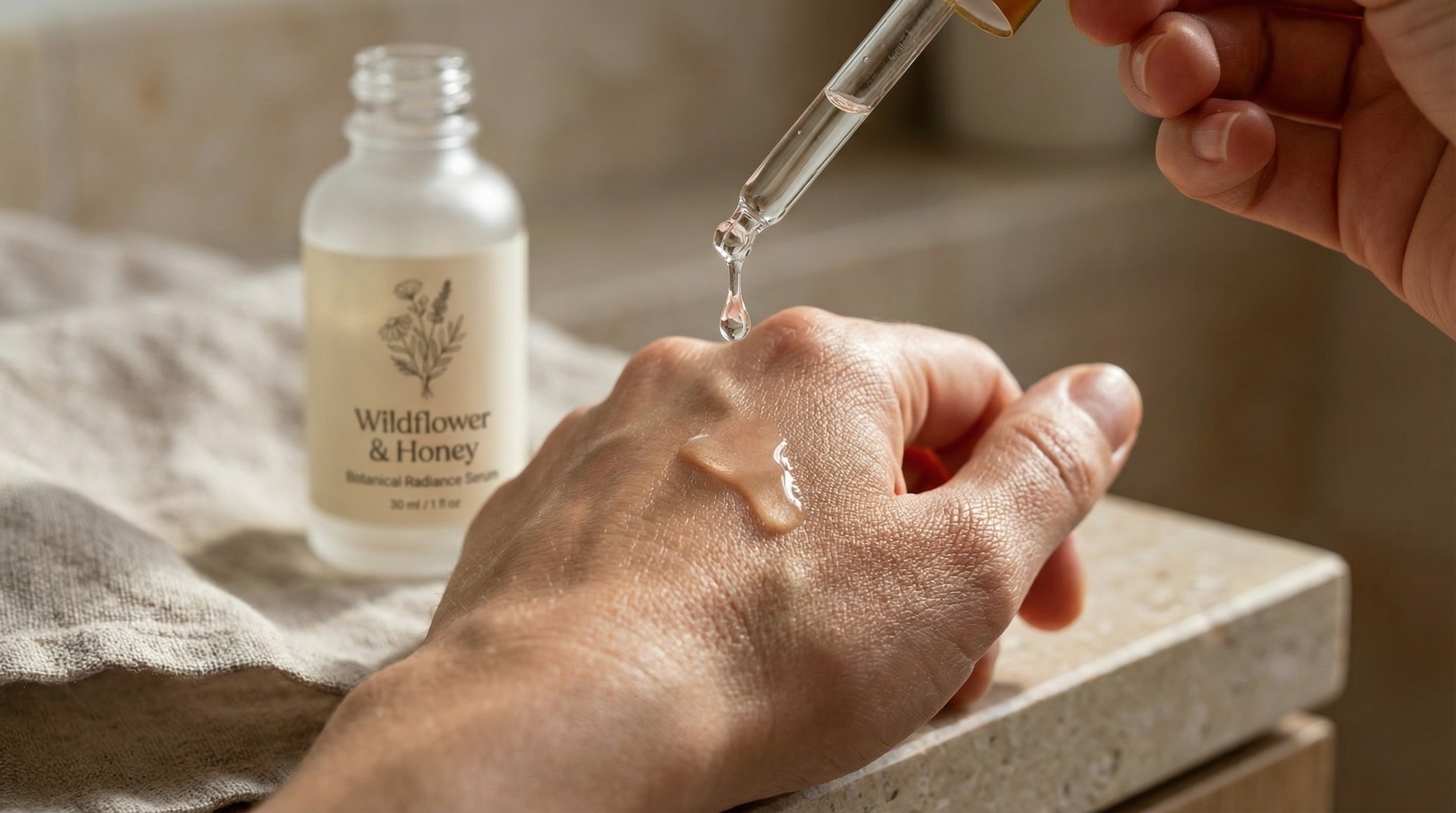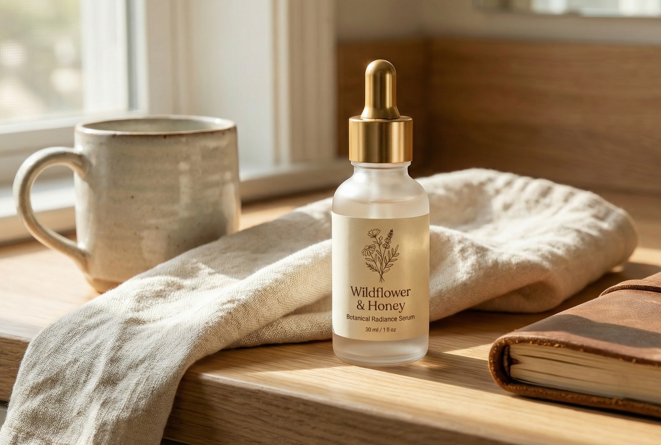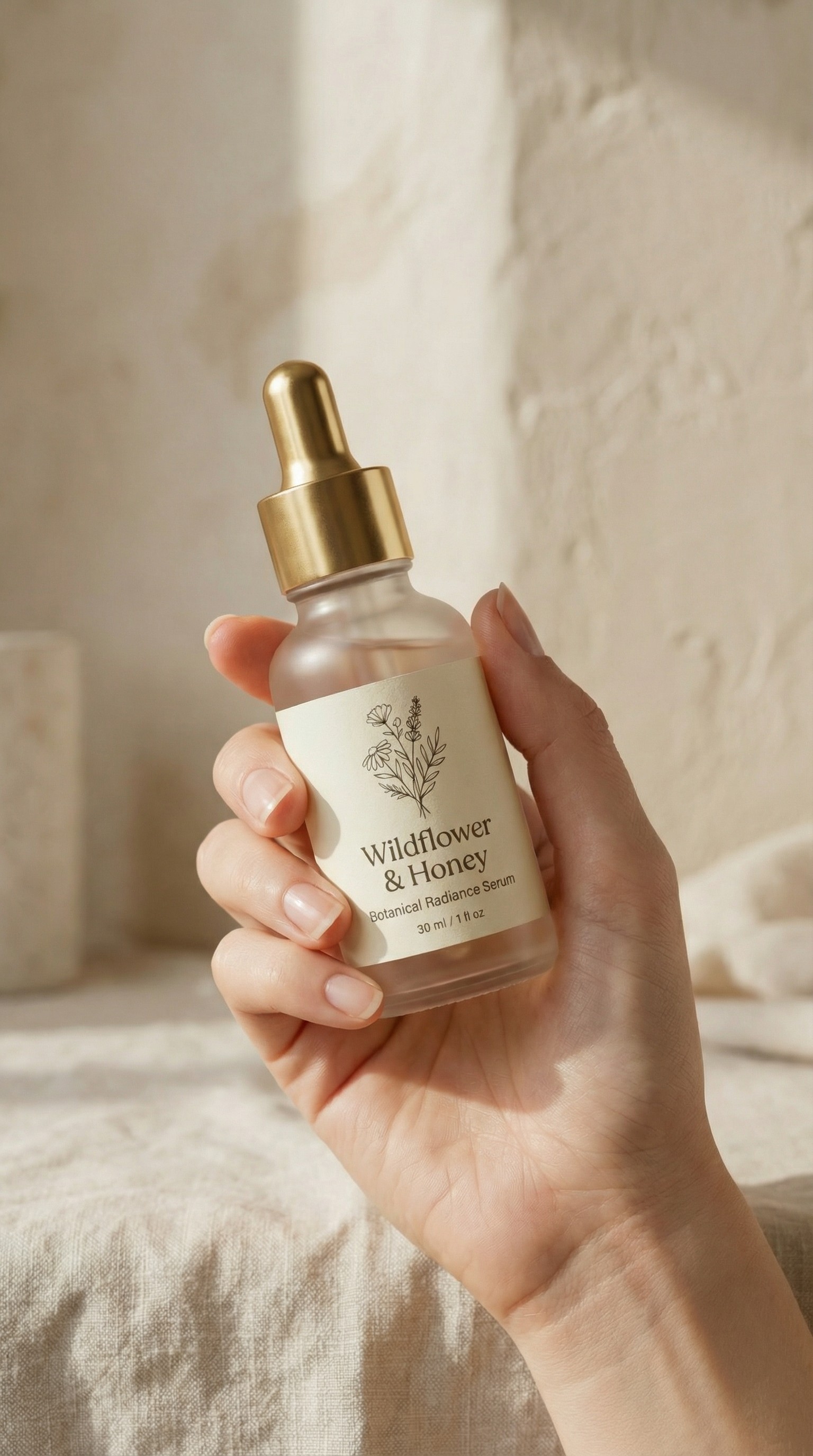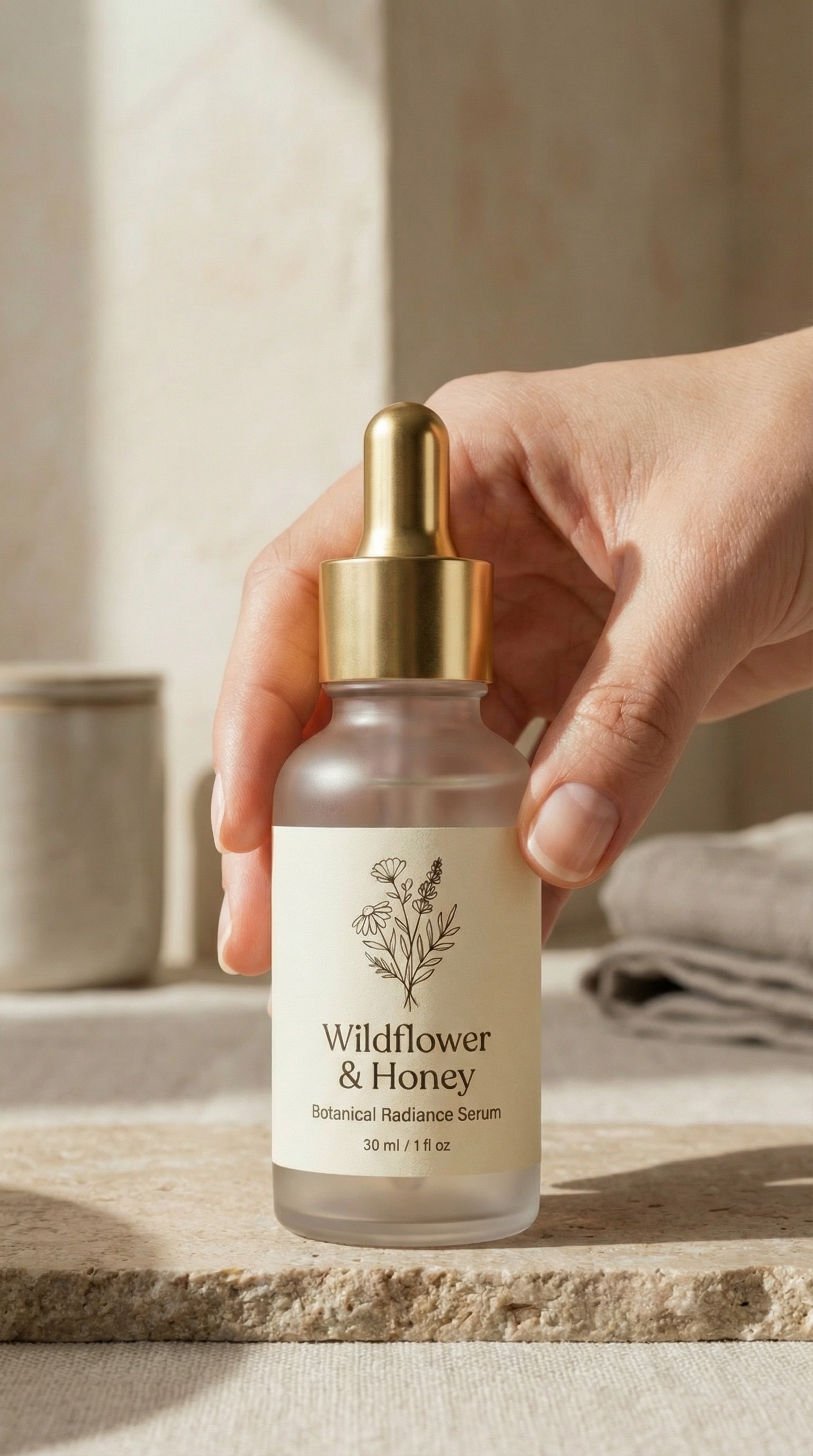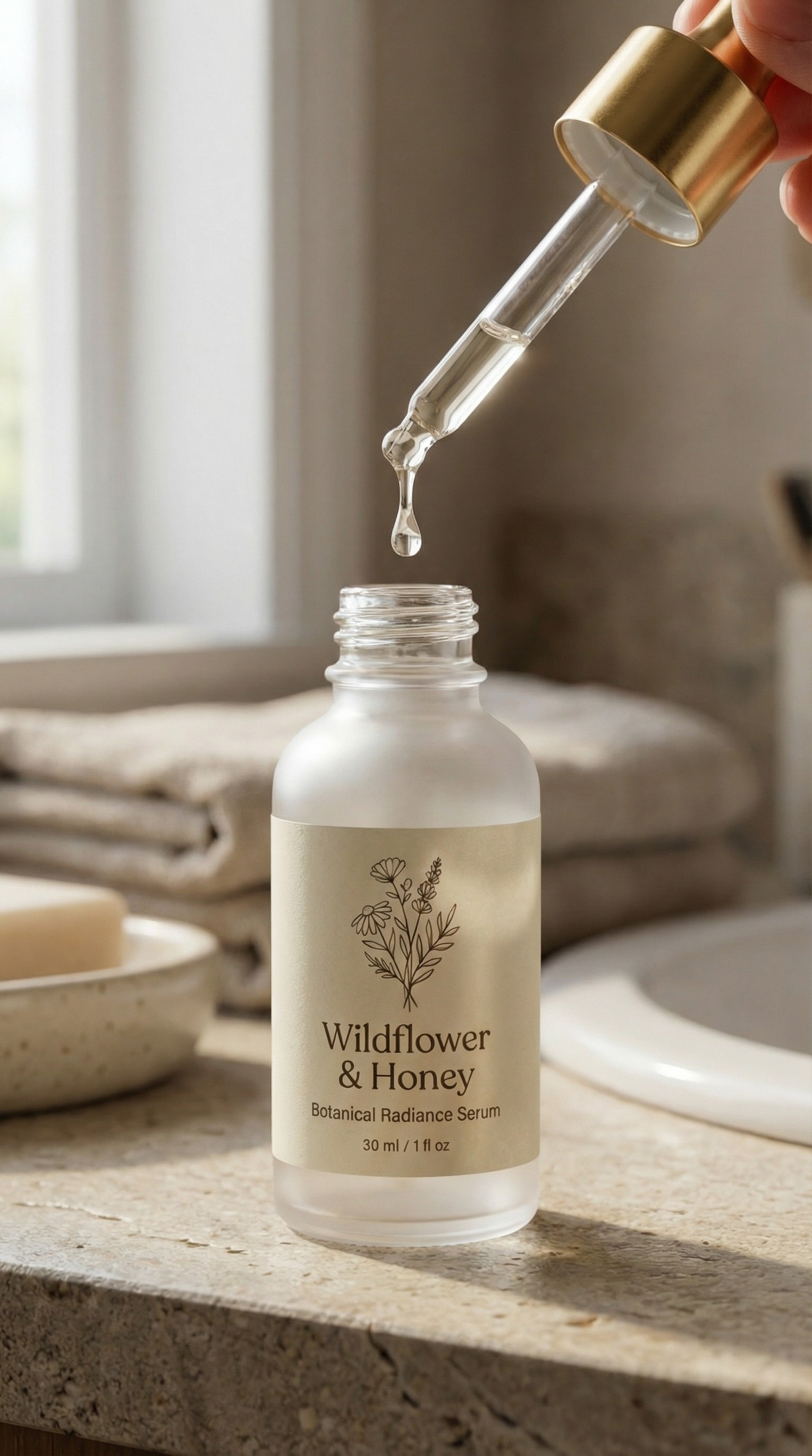 Wildflower & Honey is a botanical radiance serum designed to nourish, soften, and restore natural glow. Crafted with plant based ingredients, it delivers lightweight hydration while enhancing skin luminosity. The visual direction embraces warmth and purity, sunlit bathroom counters, soft linen textures, delicate wildflowers, and golden dropper details. Frosted glass packaging and honey toned light create an aesthetic that feels organic, calm, and quietly luxurious. Wildflower & Honey represents skincare rooted in nature, gentle, intentional, and beautifully refined.